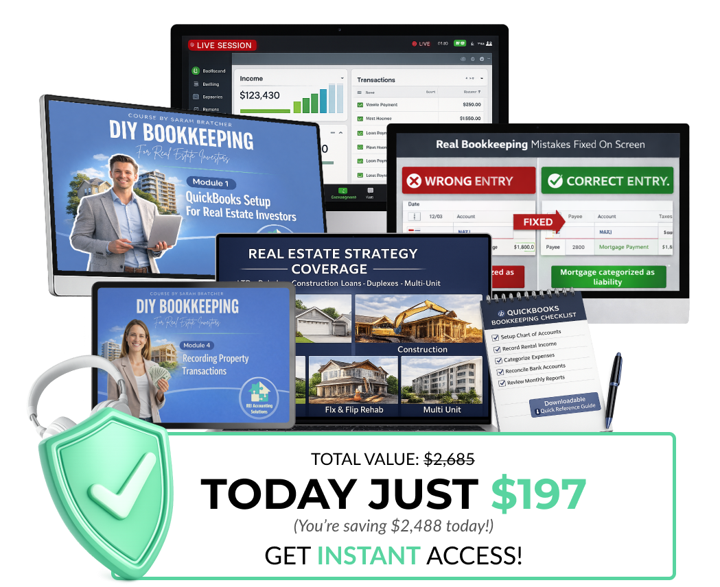 Get instant access to the full DIY Bookkeeping for Real Estate Investors training, including 18 on-demand video lessons where Sarah walks through a real company’s books from setup all the way through year-end.